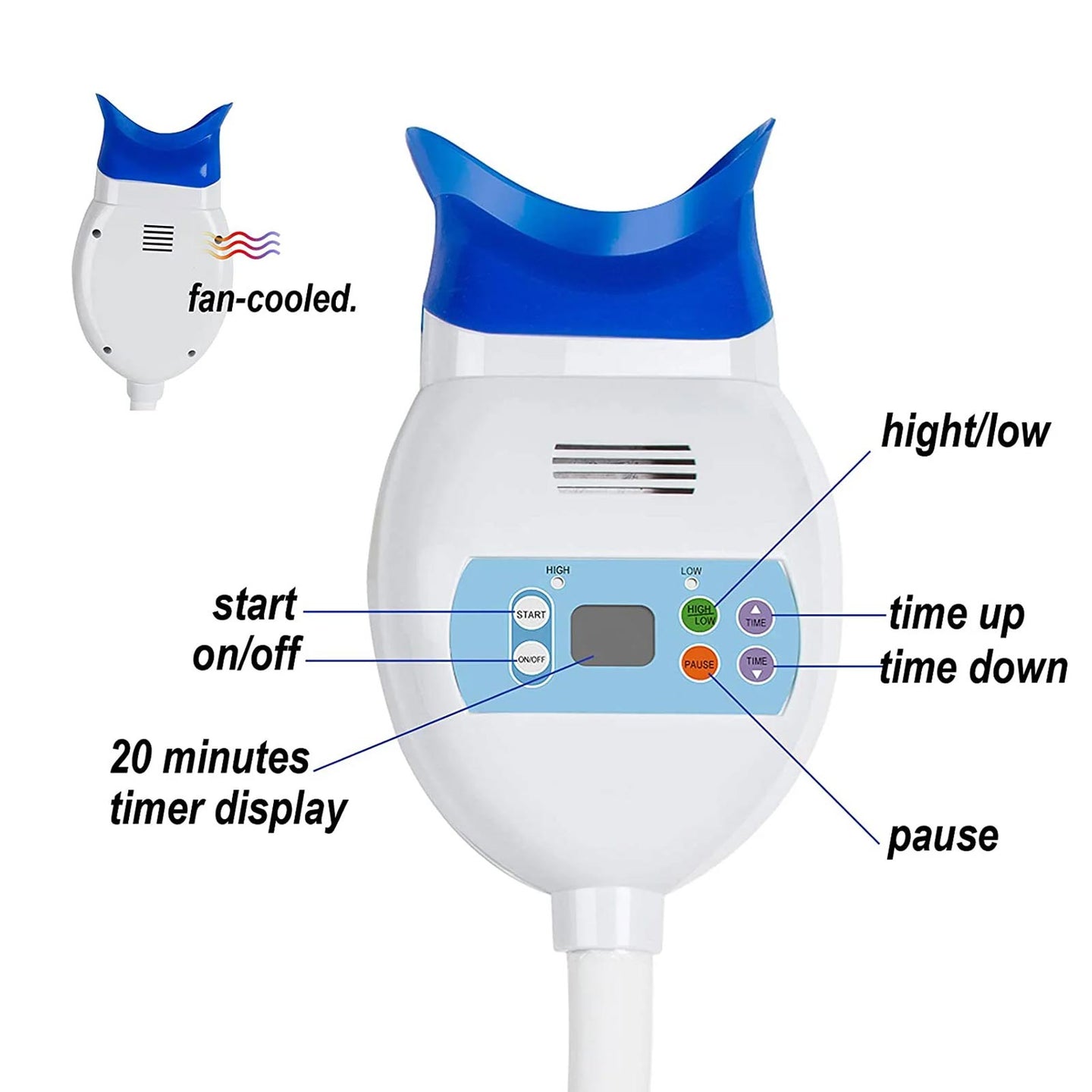 A dental bleaching or whitening light is an LED-based device used in professional and at-home settings to accelerate the tooth whitening process by activating bleaching gel containing hydrogen or carbamide peroxide. The light's specific wavelength, often a high-intensity cold blue light, oxidizes the gel's active components, which then penetrate the teeth to break down color molecules and whiten them. These devices typically feature adjustable timers and sometimes multi-directional arms for ease of use and patient comfort.