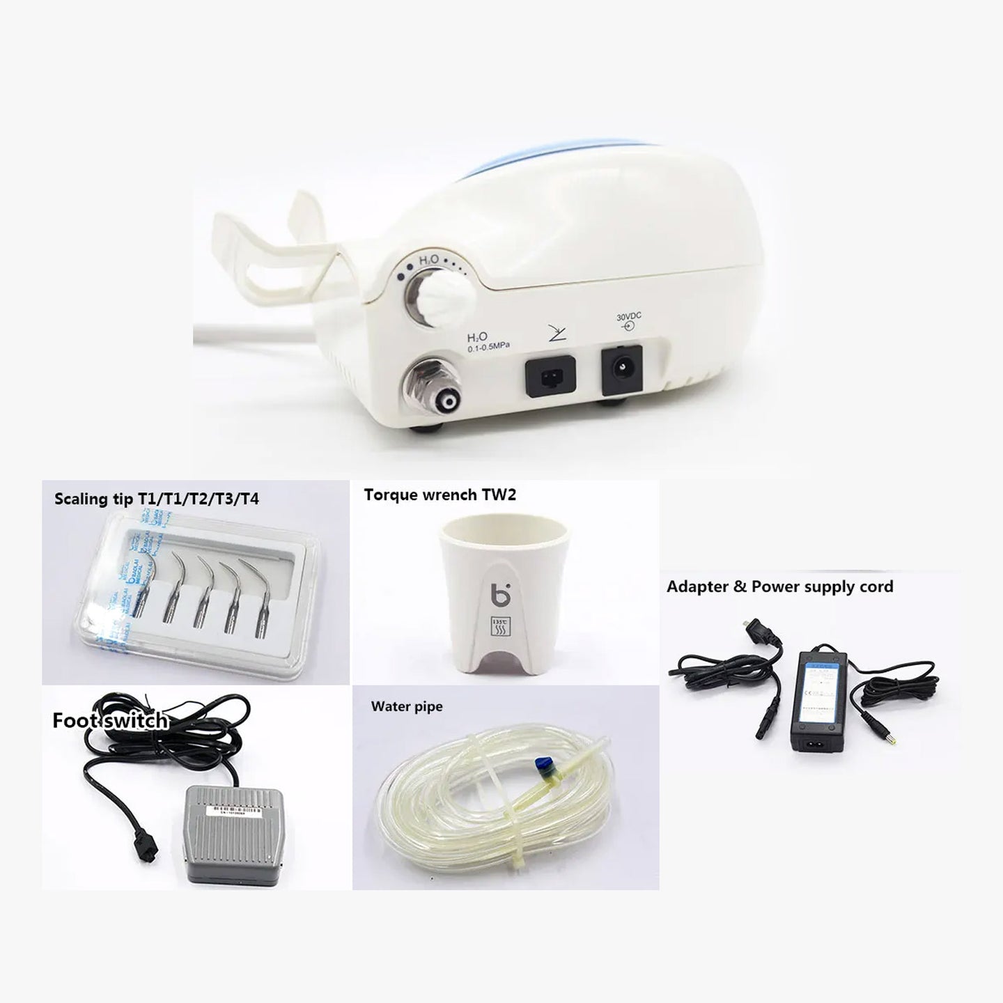 An ultrasonic LED scaler is a dental tool that uses high-frequency vibrations and a water stream to remove plaque, tartar, and stains from teeth, with the "LED" indicating a built-in light in the handpiece for improved visibility.